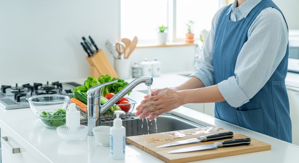 食材を扱う順序も意識します。加熱しない食材から順に扱い、例えばサラダ用の生野菜を先に切り、その後に肉や魚、最後に二枚貝を扱うようにします。それぞれの食材を扱った後には、必ず手を洗います。