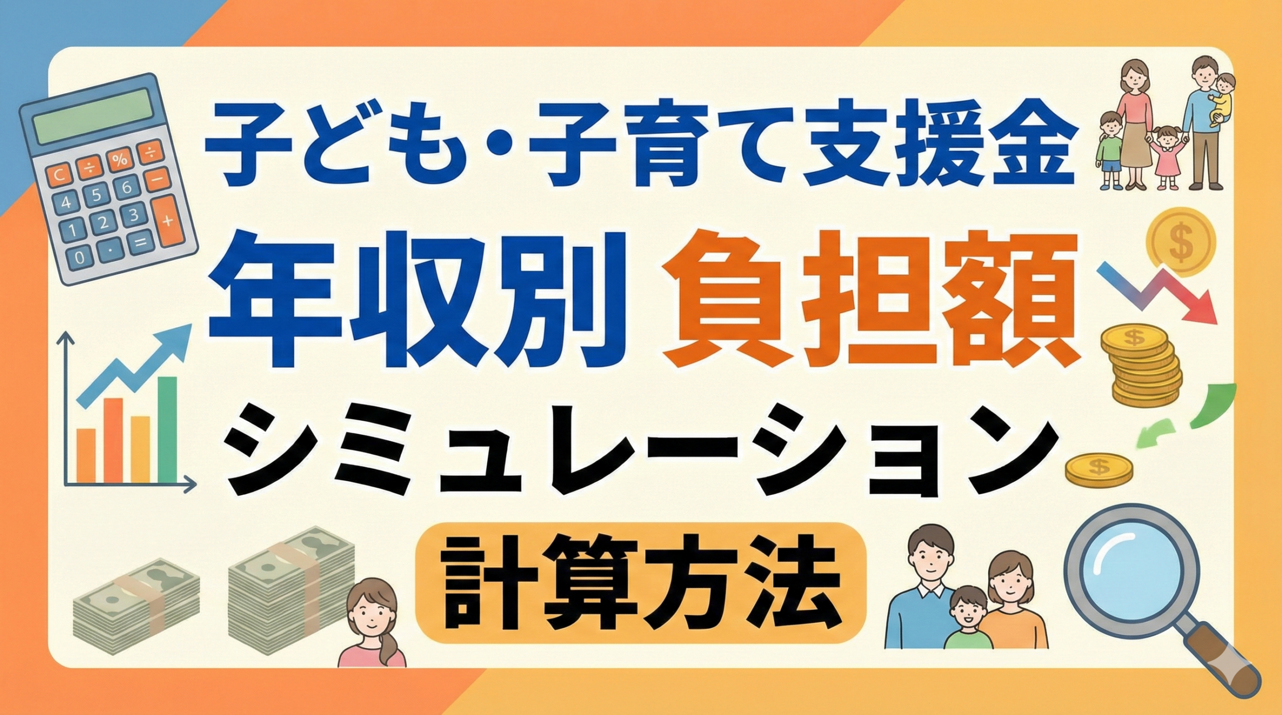 子ども・子育て支援金の年収別負担額は、2028年度の満額徴収時において、年収200万円で月額約350円、年収400万円で月額約650円、年収600万円で月額約1,000円、年収800万円で月額約1,350円、年収1,000万円で月額約1,650円が目安となります。計算方法は、加入している医療保険制度によって異なり、被用者保険では標準報酬月額に支援金率(約0.4%)を掛けて労使折半で算出し、国民健康保険では所得割と均等割を組み合わせて計算されます。本記事では、2024年に成立した子ども・子育て支援法改正に基づく支援金制度の詳細な計算ロジックと、あなたの年収に応じた具体的な負担額のシミュレーションを徹底解説します。制度の仕組みを理解することで、家計への影響を正確に把握し、拡充される児童手当などの給付と合わせた収支を見通すことができます。