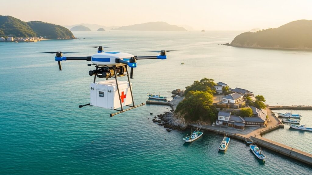 五島市は大小140余りの島々からなる列島であり、特に福江島からさらに船で渡る必要がある「二次離島」では、医師が常駐していない島も多く存在します。週1回程度の巡回診療では対応しきれない緊急の処方薬ニーズや、慢性疾患を抱える高齢者への定期的な薬の供給が課題となっていました。ANAのドローン物流事業化は、こうした「人が運ぶには非効率だが、運ばなければならない物資」を、無人化・自動化技術によって低コストかつ迅速に届けることを可能にしています。この記事では、ANAドローン物流の事業化の背景から、医薬品配送の具体的な仕組み、使用される機体の技術、そして法規制対応と将来展望までを詳しく解説します。