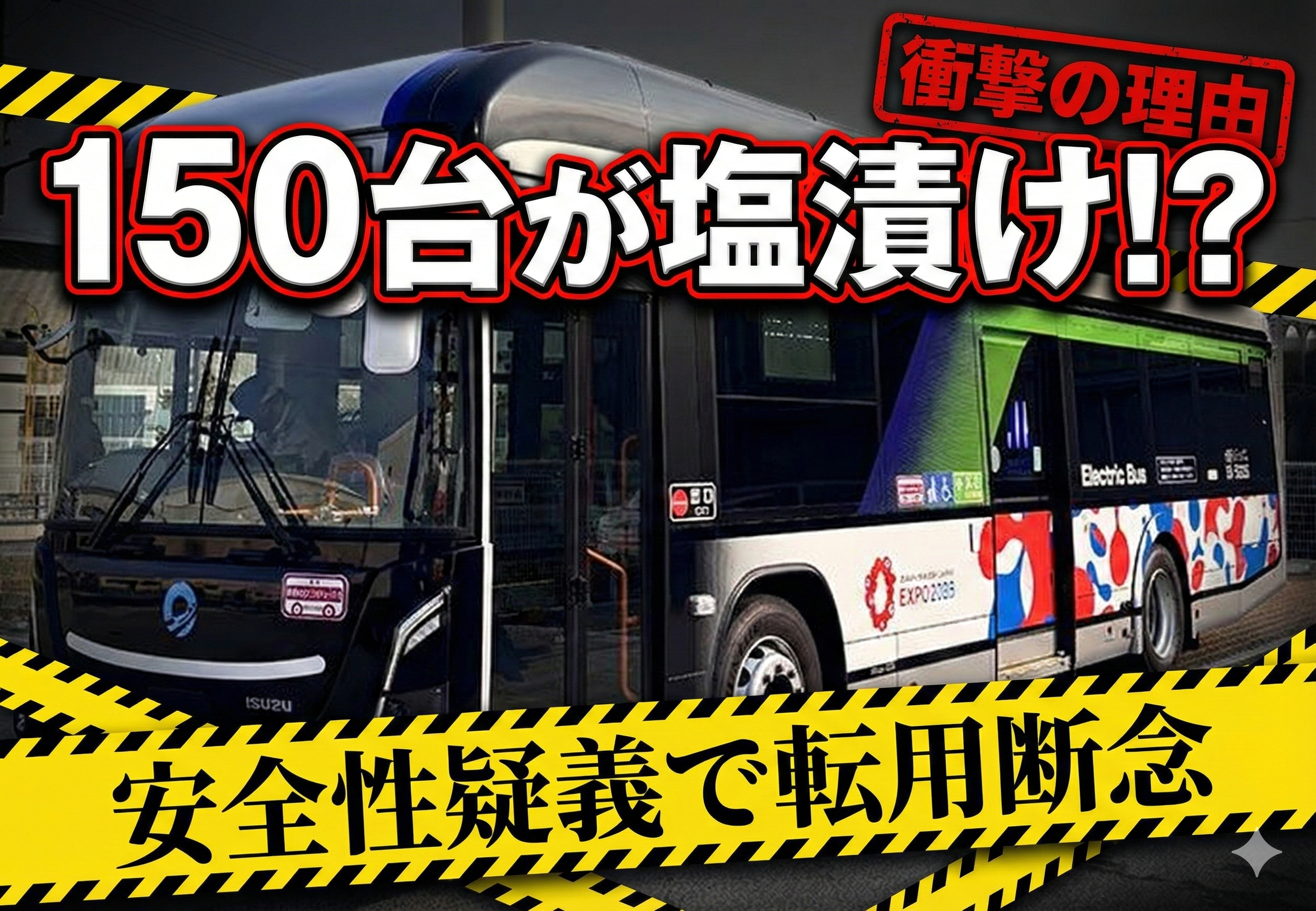 大阪・関西万博で導入されたEVバス150台が「塩漬け」状態となった理由は、安全性への重大な疑義により、閉幕後の転用先であったバス事業者が受け入れを拒否したためです。自動ブレーキセンサーが両面テープで固定されていた脱落問題や、無人状態での暴走事故、ブレーキやステアリングの機能不全といった深刻な不具合が相次いで発覚しました。これにより、阪急バスや近鉄バスなど関西の大手バス事業者は、万博終了後の車両引き受けを事実上拒否し、数十億円規模の公金が投入された150台のEVバスは行き場を失う結果となりました。