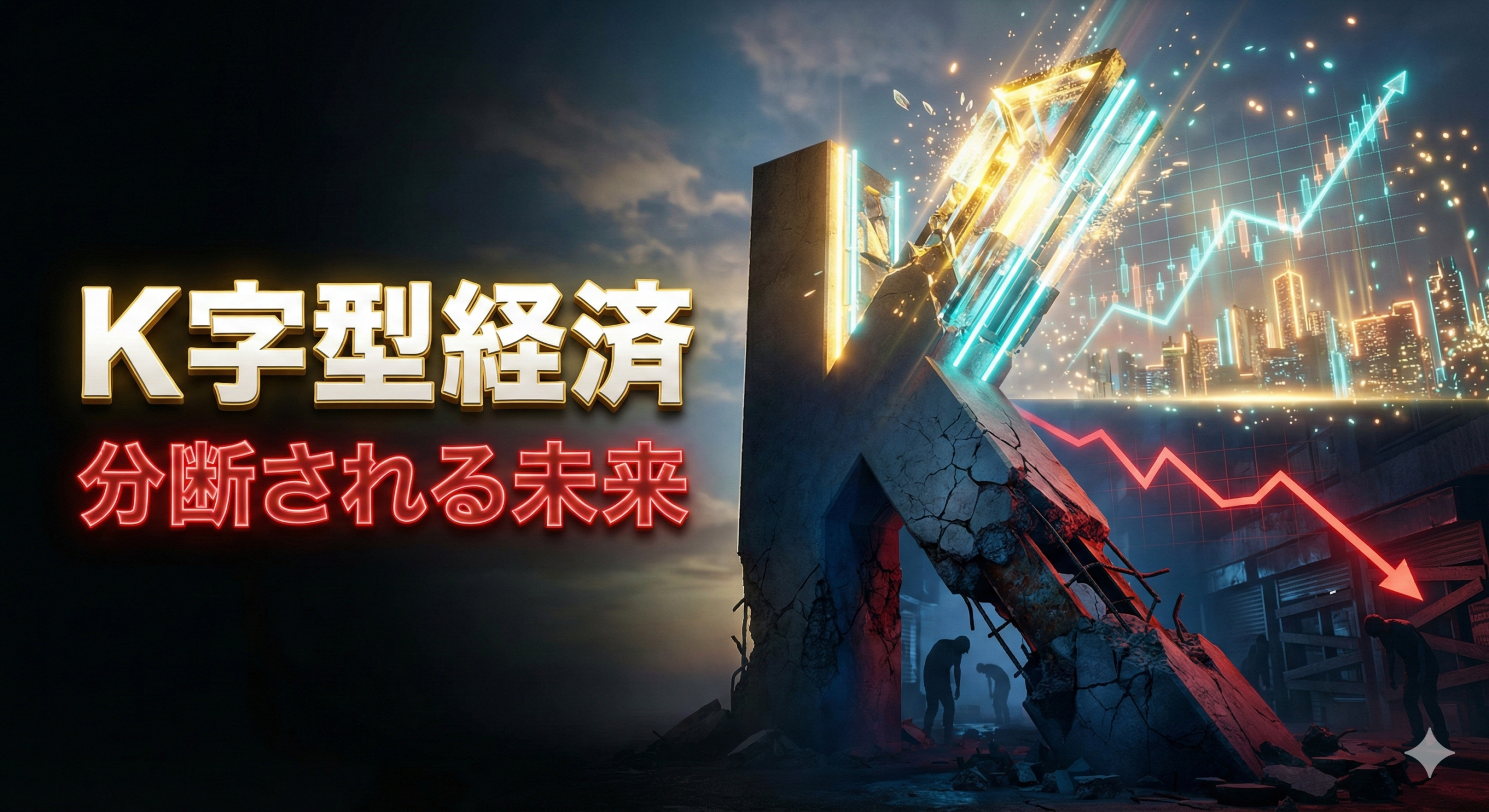 K字型経済とは、経済全体が回復・成長している中で、特定の層や産業が急速に繁栄する一方、その他の多くが停滞・衰退していくという極端な二極化が進行する経済状態のことです。この名称は、富裕層や先端産業の上昇軌道と低所得層の下降軌道をグラフにした際、アルファベットの「K」の字に似た形状になることに由来しています。2026年現在、この分断は世界各国で深刻化しており、「勝ち組」と「負け組」の格差はかつてないほど拡大しています。