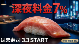 はま寿司は2026年3月3日より午後10時以降の注文に一律7%の深夜料金を導入します。深夜帯の人件費上昇や回転寿司業態特有のコスト構造が背景にあり、すき家の先行事例を踏まえた施策です。本記事では深夜料金の仕組みから導入理由、最低賃金の影響、外食業界全体への波及効果まで詳しく解説します。