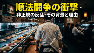 スシローの順法闘争とは、非正規労働者が法律や社内ルールを厳格に遵守することで労働環境の改善を経営側に迫った労働争議です。2023年の未払い賃金問題を発端に2024年5月に開始されました。本記事では、順法闘争の具体的な戦術や外食産業の構造的課題、賃上げの成果、日本の労働文化への影響まで、理由と背景を詳しく解説します。